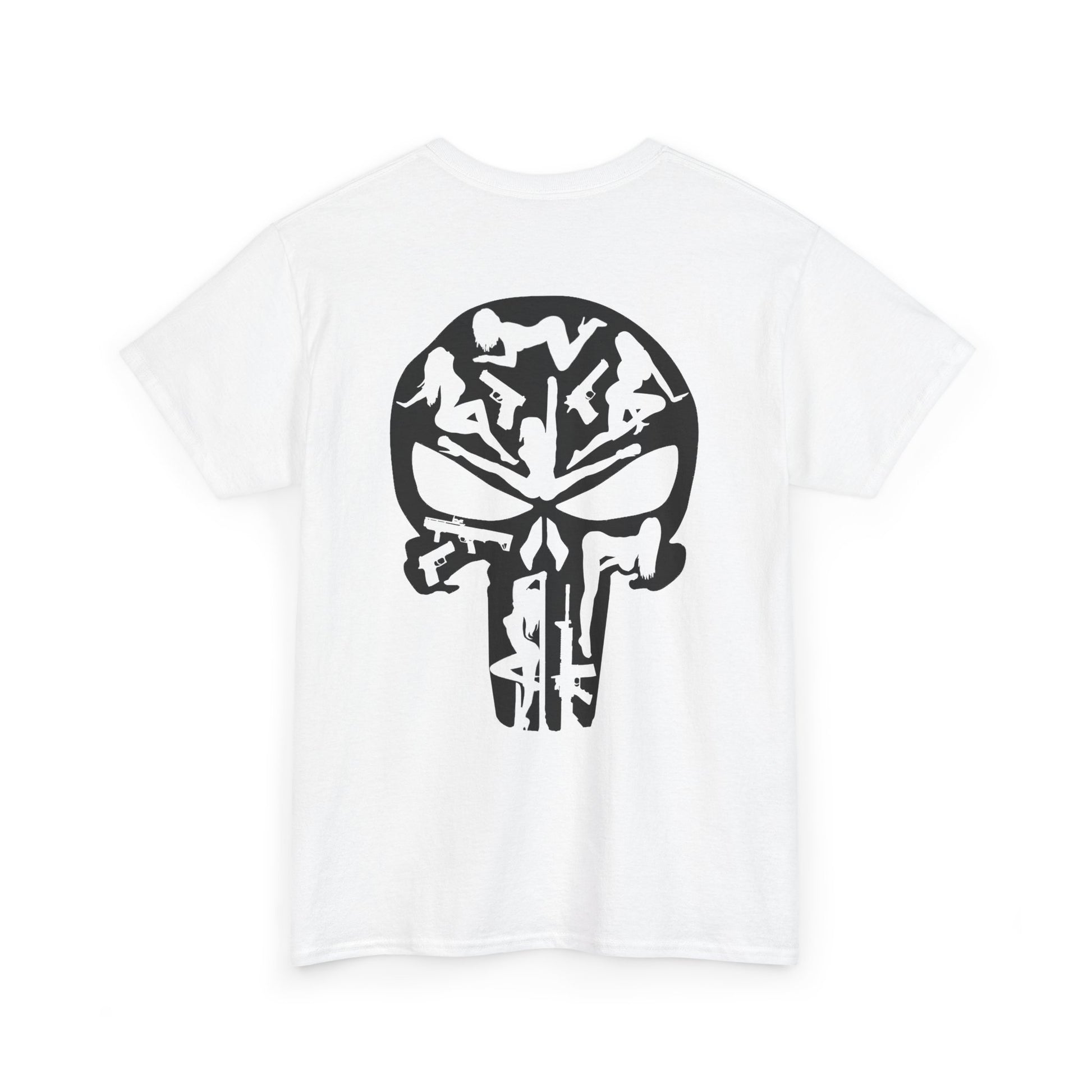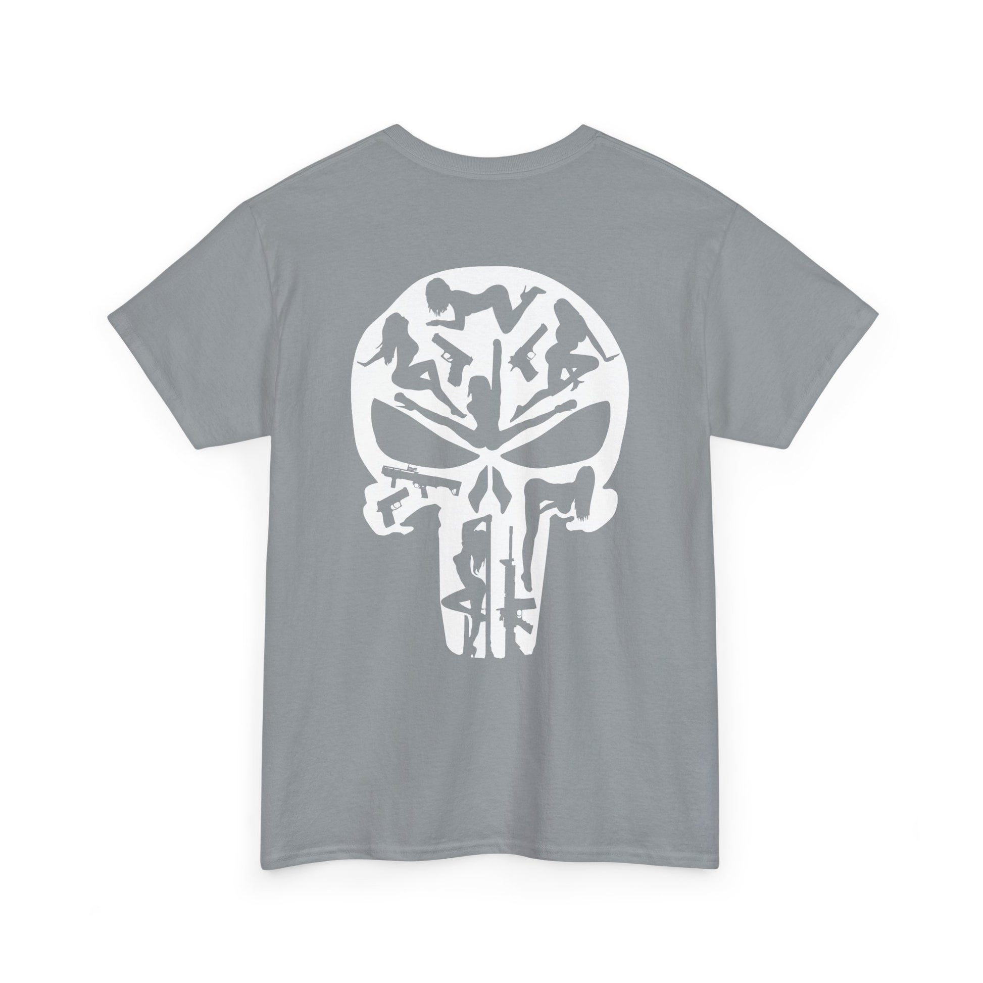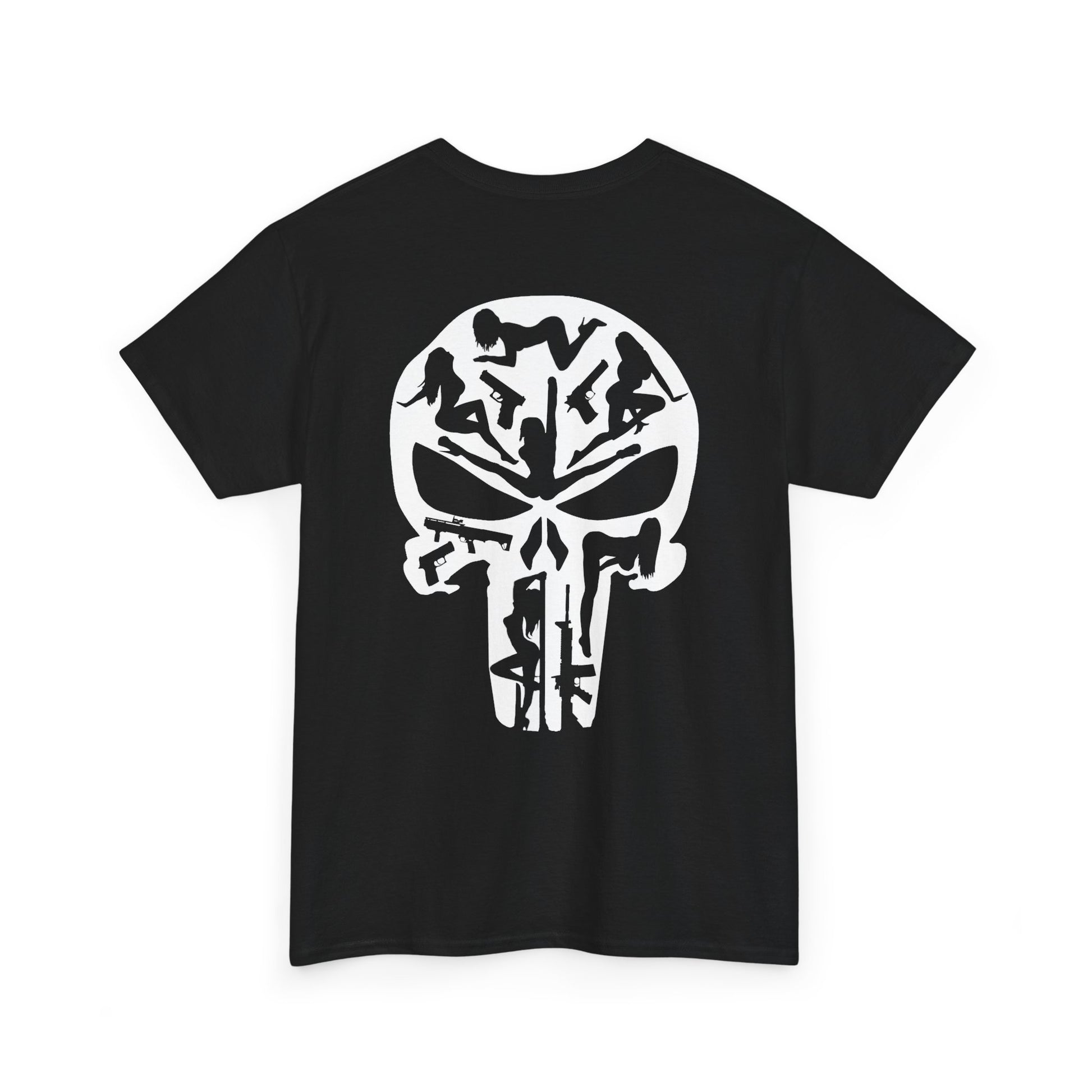 On the back, a mosaic of guns and girls, wrapped up in sick skull.